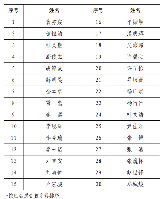 经个人申请、资格审查、面试考核,拟接收曹亦宸等30名学生进入“黄昆英才班”,具体名单如下:
