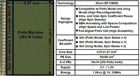 针对以上问题,湖南大学半导体学院陈卓俊教授团队成功设计并流片了一款多态组合优化问题专用处理器。提出了可重构波茨机架构,波茨单元耦合系数复用,以及逐次边界逼近退火技术,大幅提高了解决多态问题的面积效率以及能效。芯片采用65nm CMOS工艺制造,集成256个自旋单元,支持2~4bit的耦合系数位宽,兼容King’s Graph自旋网络拓扑结构,每个自旋的面积仅为4400μm2,并在CT图像聚类、合金相变模拟等应用中完成验证。与同期先进工作相比,该处理器在求解速度、归一化面积等方面达到了最优水平。